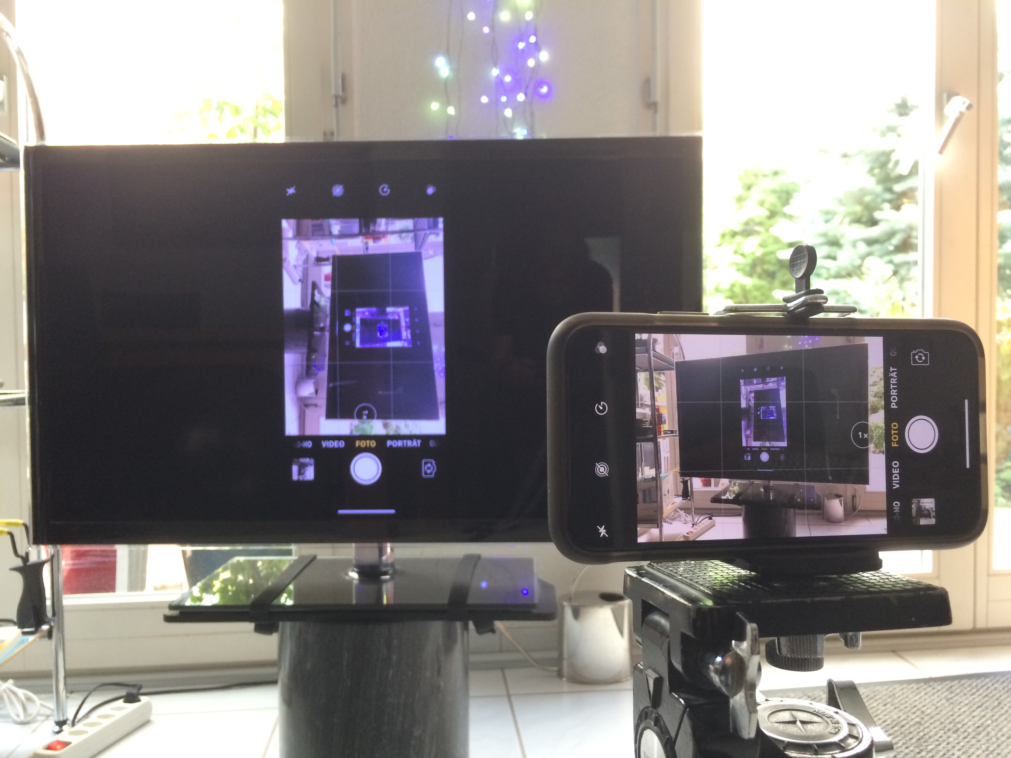 Was andere teilweise kostenlosen Foto- und Video-Apps problemlos beherrschen und auch alle alten iPhones – nämlich das Rotieren des Bildschirmes beim Spiegeln auf Apple TV – stellt nach fast zwei Jahren für Apple Cupertino ein unlösbares Problem dar. Stell’ dir vor, du möchtest ein Gruppenbild zusammen mit deiner Familie, Freunden oder Mitarbeitern aufnehmen. Die praktische Hilfe dabei ist ein TV, in dem sich alle Teilnehmer der Fotosession betrachten können. Die Verbindung mit Hilfe des Apple TV klappt auf Anhieb, so wie die Werbung verspricht. Die Apple-eigene App «Kamera» im iPhone X jedoch versagt beim Rotieren vom Hochformat auf das Querformat, wie du auf den folgenden Fotos siehst.